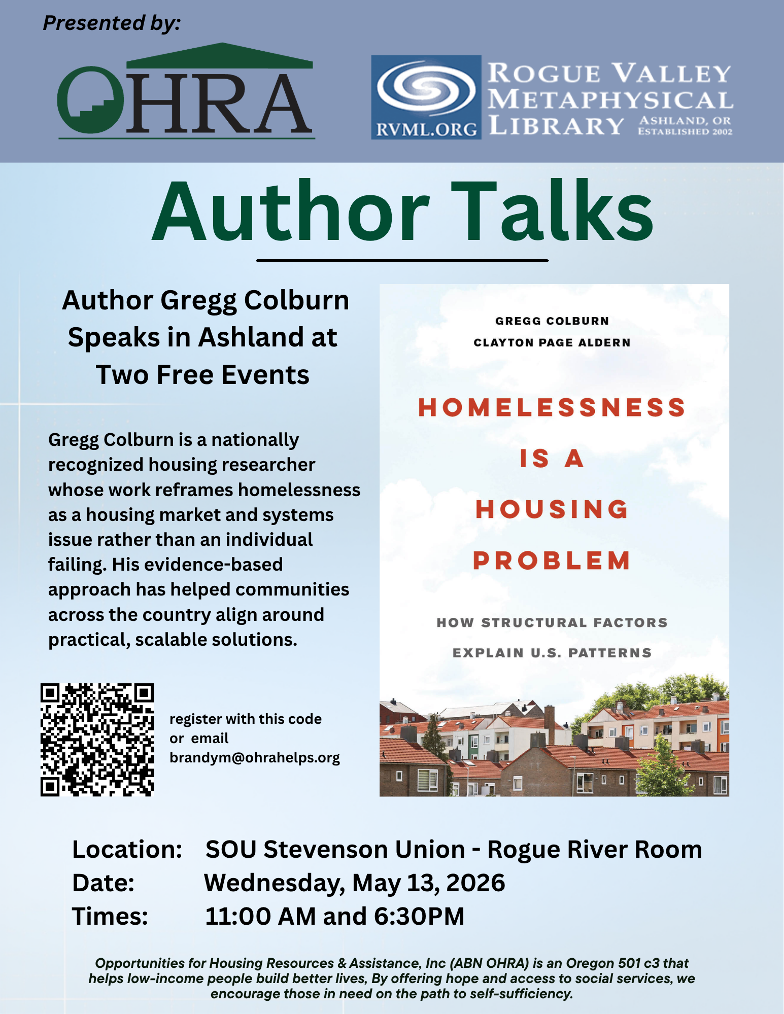 “Homelessness is a Housing Problem” Author Greg Colburn to Speak 5/13/26